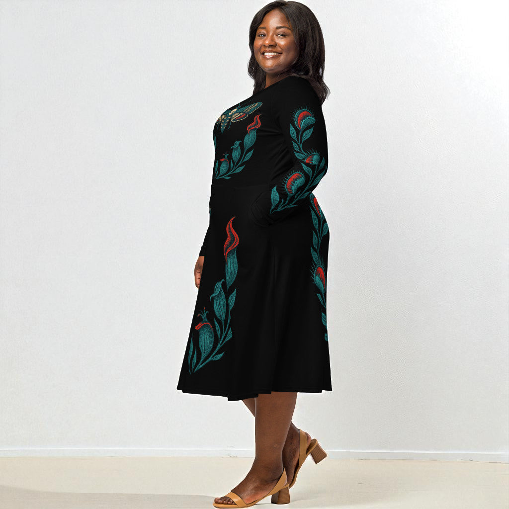 Un vestido elegante y diferente: la polilla calavera preside el pecho con sutileza y las líneas de las plantas carnívoras estilizan la figura sin recargar. El negro funciona como un lienzo que hace brillar el arte y afina la silueta. Resultado: sofisticación con carácter, sin gritos.